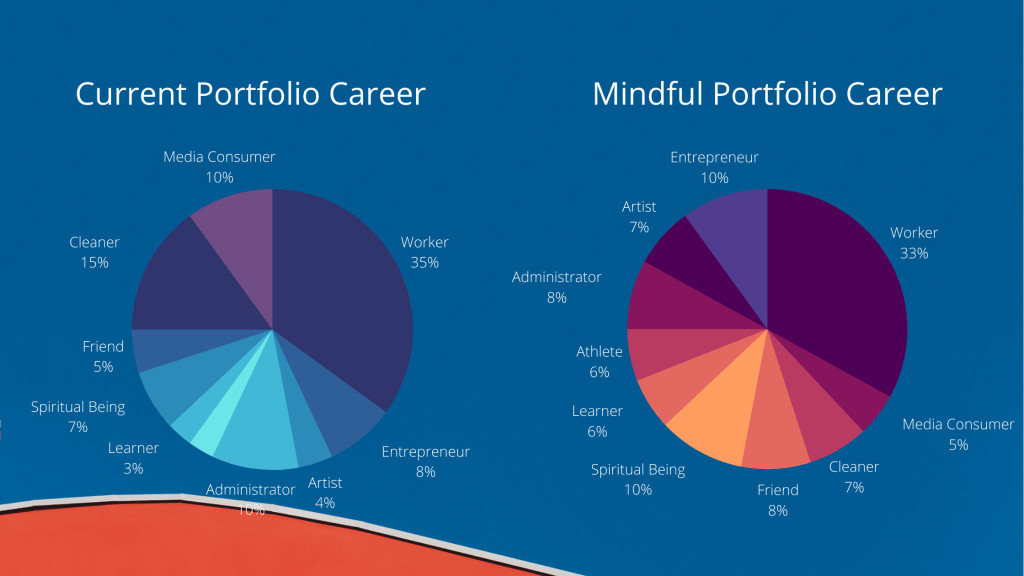 What is a portfolio career? Most people think of a portfolio career as a working style where you combine multiple streams of income, but I am taking a holistic approach to the concept of career, as developed by Psychologist Donald Super. According to Super a career refers to all the different life roles individuals have throughout their lifespan such as sister, friend, worker, caregiver, accountant, cook, student, etc. When you think of a portfolio career, think about the different roles where you currently direct the most energy. For most of us, few of these roles generate income, but each role takes up time and energy. In this exercise you will analyze your portfolio career, reimagine changes that promote wellness and set an intention for change.