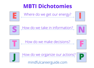 How do I determine my personality type? When you take a career assessment or survey to determine your MBTI four-letter code, you are answering questions based on four dichotomies in the illustration below. When I work with clients, I explain each of the dichotomies and ask them to choose a preference based on the information they provide about their natural way of being. It’s about the actions and choices you make daily, without giving them much thought. In order to get an accurate interpretation of your personality preferences, I recommend meeting with a career counselor to verify your code.